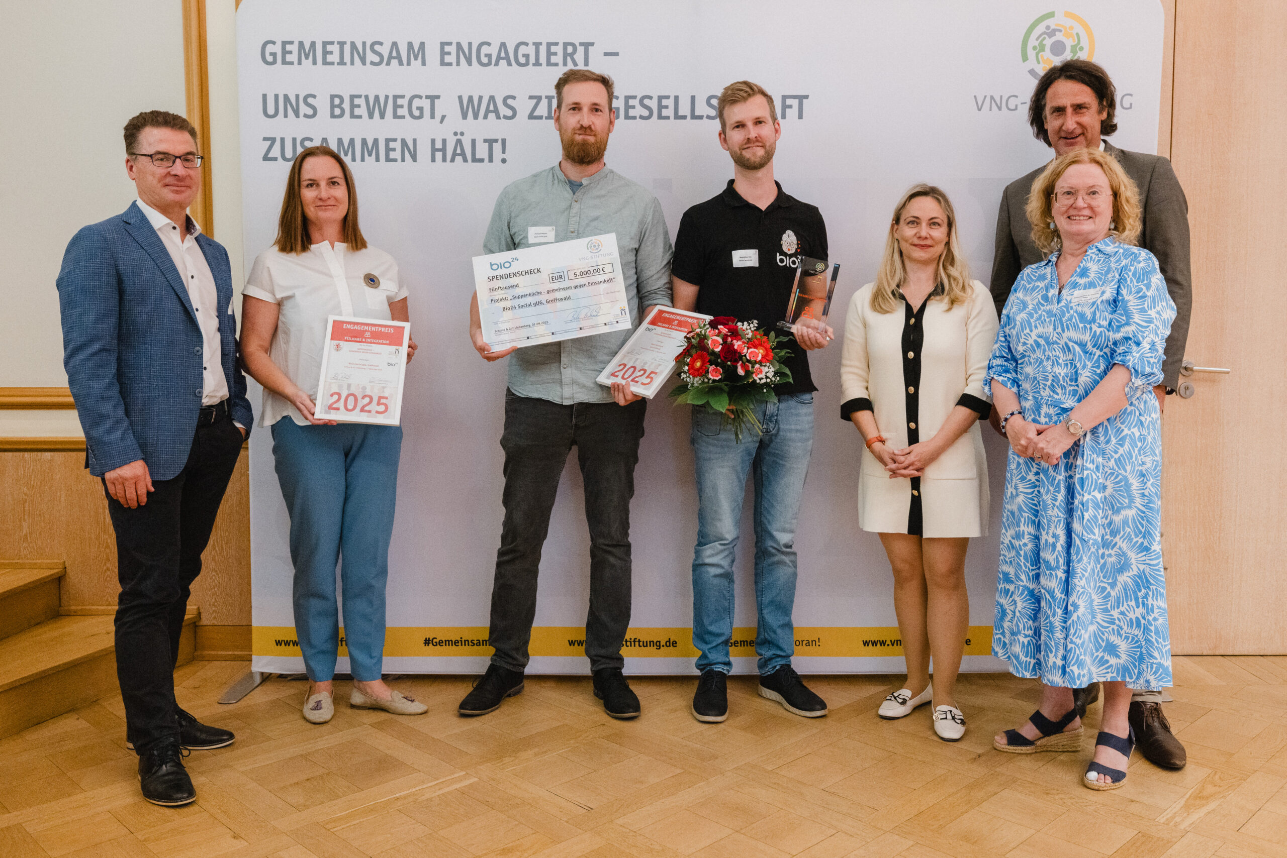 „Als Vereinsvorsitzender von aiR e.V. hatte ich die Ehre, den Engagementpreis 2025 der VNG-Stiftung in der Kategorie „Teilhabe & Integration“ Bio24 Social gUG auf Schloss und Gut Liebenberg zu verleihen. Ausgezeichnet wurde das beeindruckende Projekt „Suppenküche – gemeinsam gegen Einsamkeit“ – ein Begegnungsort, an dem gesunde Mahlzeiten aus geretteten Lebensmitteln angeboten werden.“